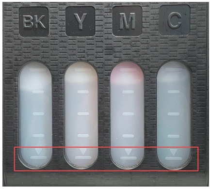 检查墨仓是否有充足墨量,当墨量低于墨仓下线时,请及时补充墨水。