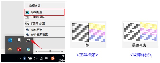 在电脑屏幕右下角找到打印机图标,点击右键选择“喷嘴检查”/“打印头清洗”。