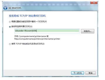 2.3 选择“按名称选择打印机”,输入“\\主机端计算机名\共享打印机名”,如图(8),进行下一步。注:输入的计算名和打印机共享名不需要区分大小写。