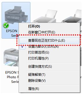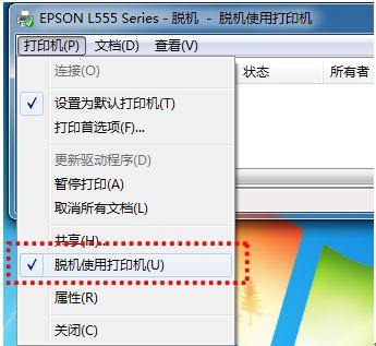 Windows 7:右键点击打印机图标选择“查看正在打印什么”如图(8),弹出打印任务对话框,点击左上角“打印机”菜单,点击“脱机使用打印机”,取消脱机,如 图(9)