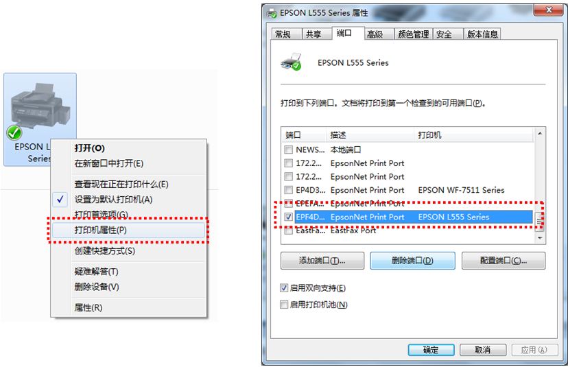 1).右键点击打印机图标选择“属性”(对于Windows 7系统选择“打印机属性”),点击“端口”确认是否选择“EpsonNet Print Port”端口,如图(10)