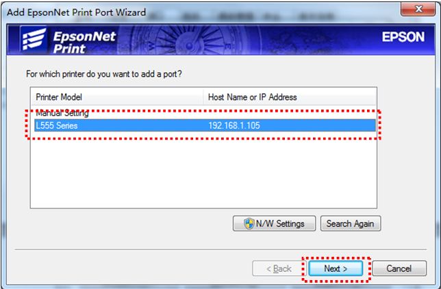 3).EpsonNet Print Port程序会自动搜索到网络中的爱普生打印机,选择L555,然后点击“Next”,如图(12)。
