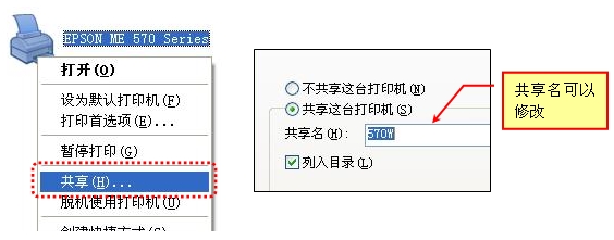 右键点击打印机图标,选择共享,弹出窗口后选择“共享这台打印机”,共享名可以自己设定,点击“确定”,如图(1);