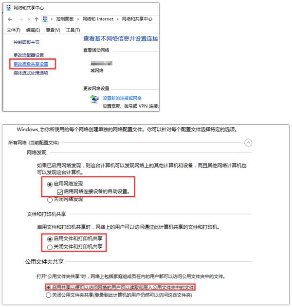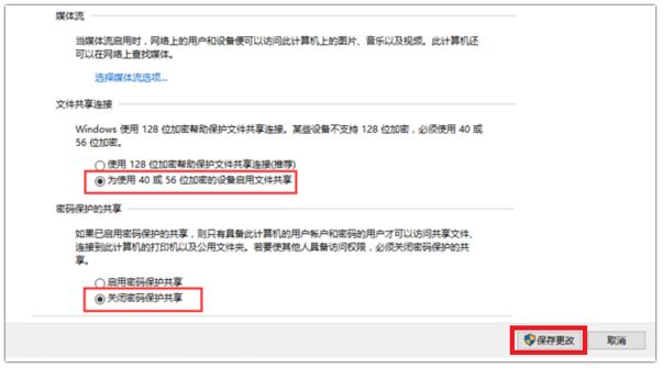 第二步:点击左上方“更改高级共享设置”按钮,按照如下图示,设置相关参数,设置完成后点击“保存修改”,重新尝试连接即可。